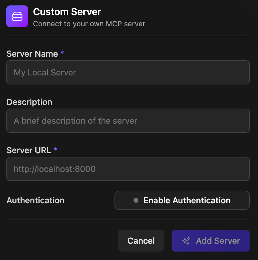 如上图所示依次填入Server Name、Description(可选)和Server URL,点击右下角Add Server按钮,即可完成MCP服务的添加。其中Server URL为提供服务的MCP Server地址,例如http://localhost:8000/xyzen/mcp/my-custom-mcp。