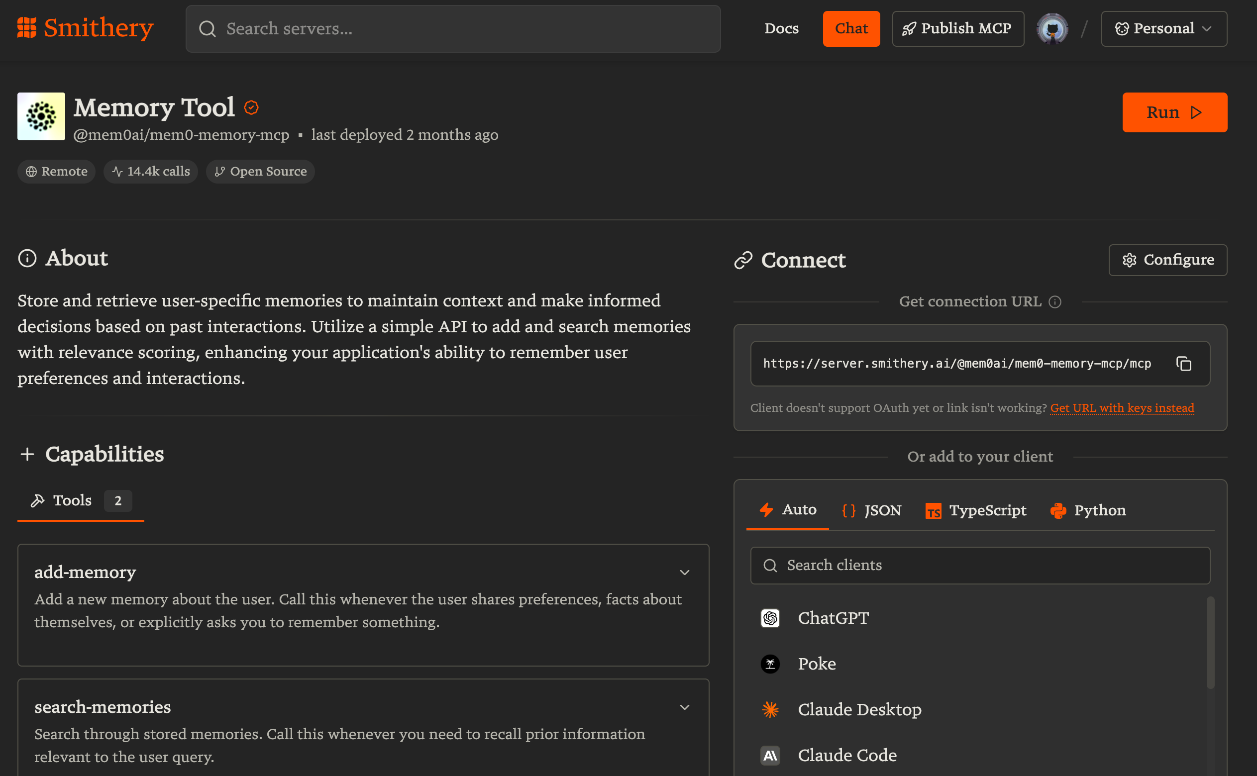 则只需把对应 MCP 服务器的 URL 填入 Server URL 即可完成导入。具体获取 MCP 服务器 URL 的方式请参考对应 MCP 服务器的文档说明(以Smithery网站为例)。